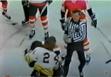 Helmets? Visors? Name-bar? Nah, the 70s gladiators didn’t need those extras. They just wanted to get after it. That’s why, in hindsight, we were lucky watch two of the meanest and toughest dudes ever drop-the-gloves like it was nothing. In this bout, O’Reilly started strong by rocking the Flyers enforcer with a flurry of huge left hooks and was in total control the whole scrap. I can only imagine how frustrating it would be to get rocked with a series of left-hooks, held, jerseyed, and then fed more punches. Well, I guess we’ll have to ask Dave Schultz because that’s exactly what Taz did to him that Sunday night in the Garden. Tell me if I’m wrong, but I’m starting to notice a pattern: whoever gets rocked loses. O’Reilly won::Schultz lost…Bruins 5::Flyers 3.